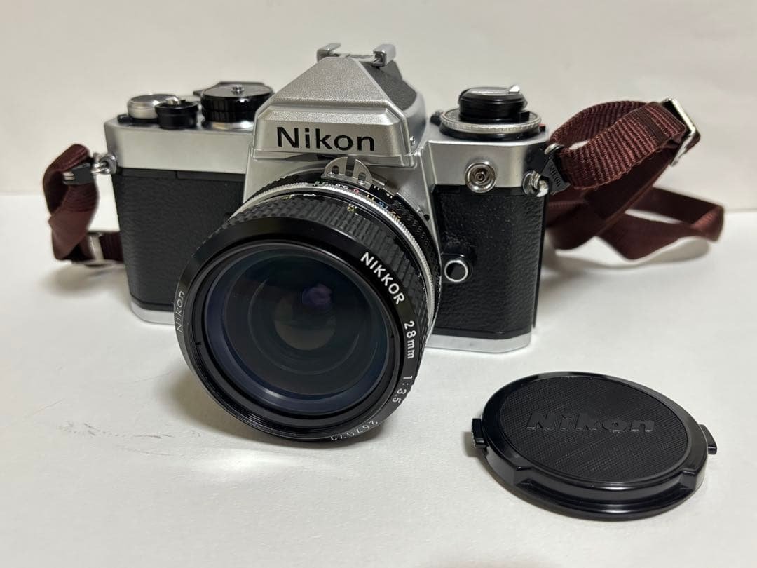NIKON FE ブラック NIKKOR 50 1.4!!!!!\rコレクションが増えすぎたため泣く泣く出品中です( ; ; )\r大切なカメラですが是非大切に使っていただける方にお譲りしたいと思います( ; ; )\r\r【外観】\r洗浄剤にて清掃済み。\r目立つ凹み傷は、ありません。\r匂いもありません。\rベタつき汚れありません。\r底板のみ傷があります。\r\r【動作】\r露出計動作確認済。\rシャッター全速正常に切れます。\rフォーカスリング正常。\r絞り動作に問題ありません。\r絞り羽根も正常に動作します。\r\r【光学】カビもなく綺麗です。\r\r【付属】純正フロントレンズキャップ\r レンズフィルター\r\r【モルト】全て交換済みです。\r\r【ファインダー】清掃済。綺麗です。\r\rNikon FEフィルム一眼レフカメラ、Nikkor 50mm f/1.4レンズ付き。\r\r- ブランド: Nikon\r- モデル名: FE\r- レンズ: Nikkor 50mm f/1.4\r- 製造国: Japan\r\rご覧いただきありがとうございます。| カテゴリー: | テレビ・オーディオ・カメラ>>>フィルムカメラ>>>一眼レフカメラ(フィルム) |